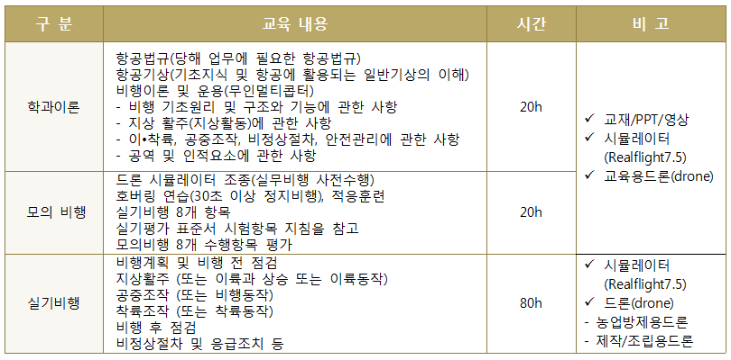 – 드론관련 항공법규, 항공기상, 항공역학(비행이론) 및 모의비행을 통해 드론 구조와 그 기능을 파악하여 조정할 수 있는