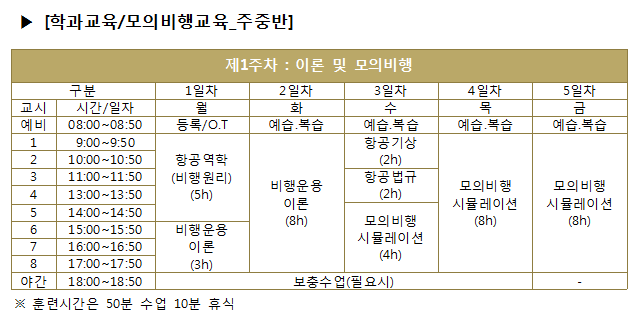 [주중] 이론/모의비행(5일) : 월~금, 실기비행(10일) : 월~금(09:00~18:00)