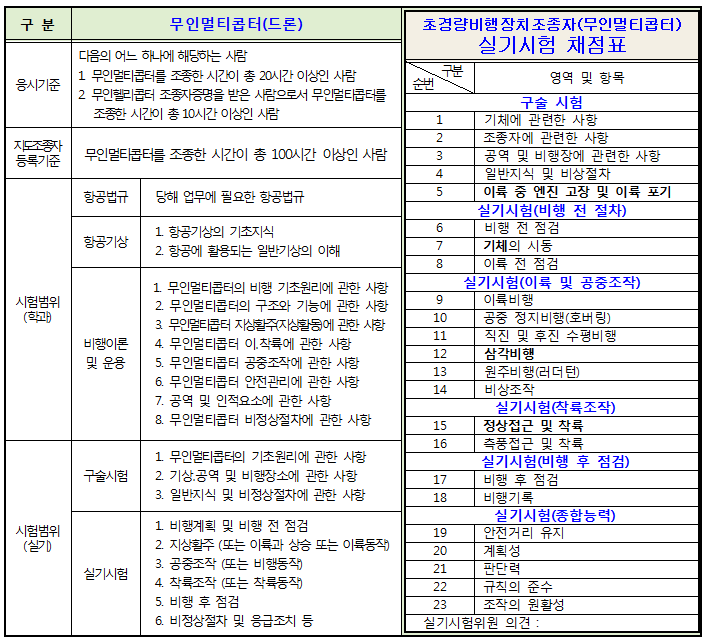 – 교육원 교육 이수 : 학과 시험 교육원 자체 시험으로 대체/면제 - 비행교육 이수 : 20시간(12kg 이상의 지방항공청에 신고된 기체)