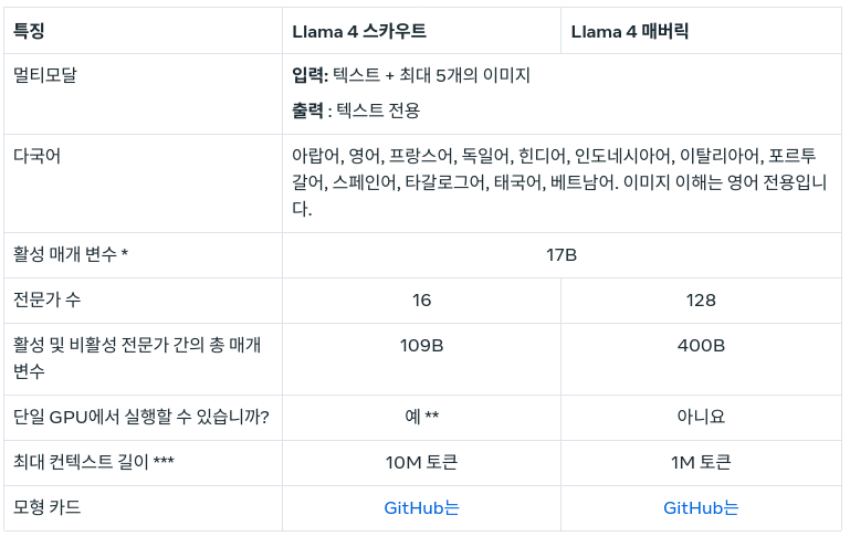 * 모델의 총 매개 변수는 각각 109B 및 400B이지만 언제든지 주어진 토큰에서 컴퓨팅(“활성 매개 변수”)을 실제로 수행하는 매개 변수의 수는 항상 17B입니다. 이것은 추론 및 훈련에 대한 후행을 줄입니다.
